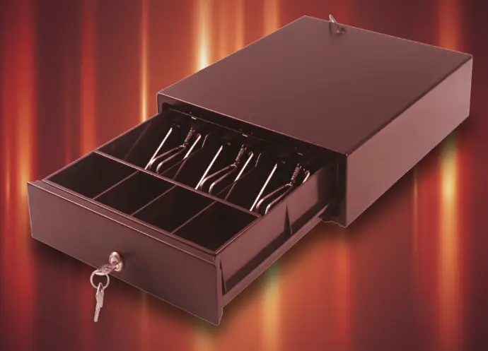 Carcasa y cajón de metal. Caja para 4 billetes y 5 monedas. Apertura manual y automática. Seguridad con llave.